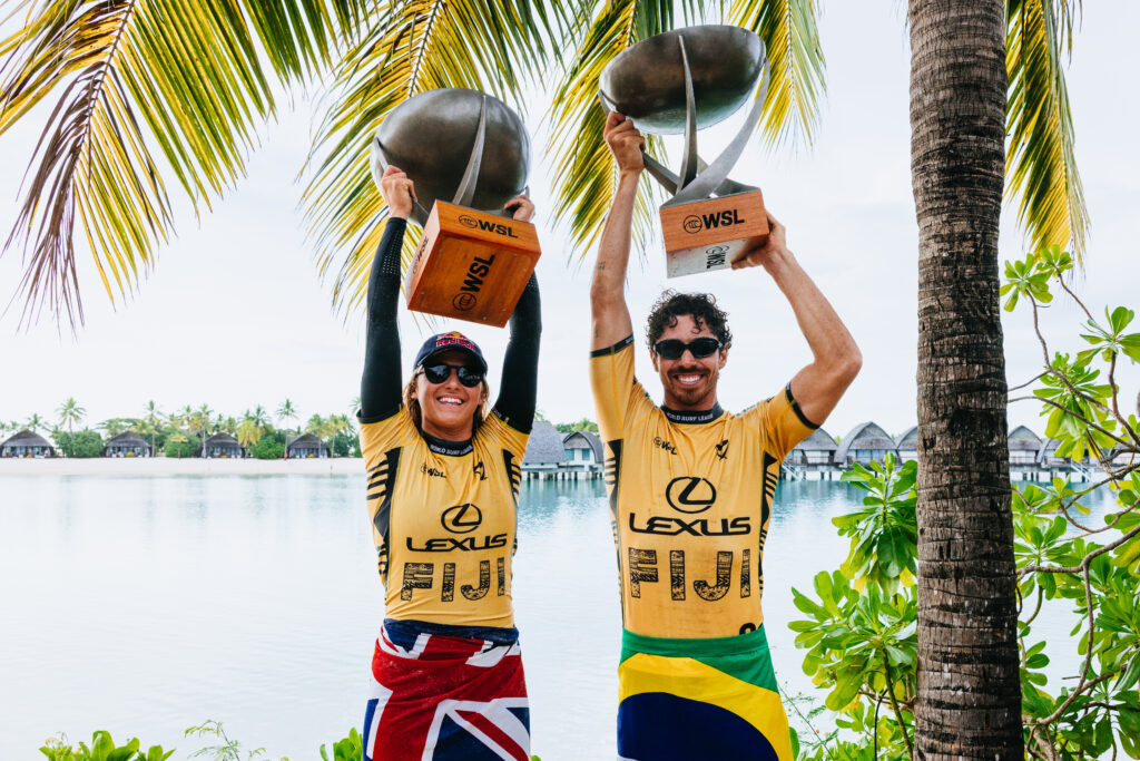CLOUDBREAK, FIJI – SEPTEMBER 2: Molly Picklum of Australia and Yago Dora of Brazil after winning the 2025 World Title at the Lexus WSL Finals Fiji on September 2, 2025 at Cloudbreak, Tavarua, Fiji. (Photo by Cait Miers/World Surf League)